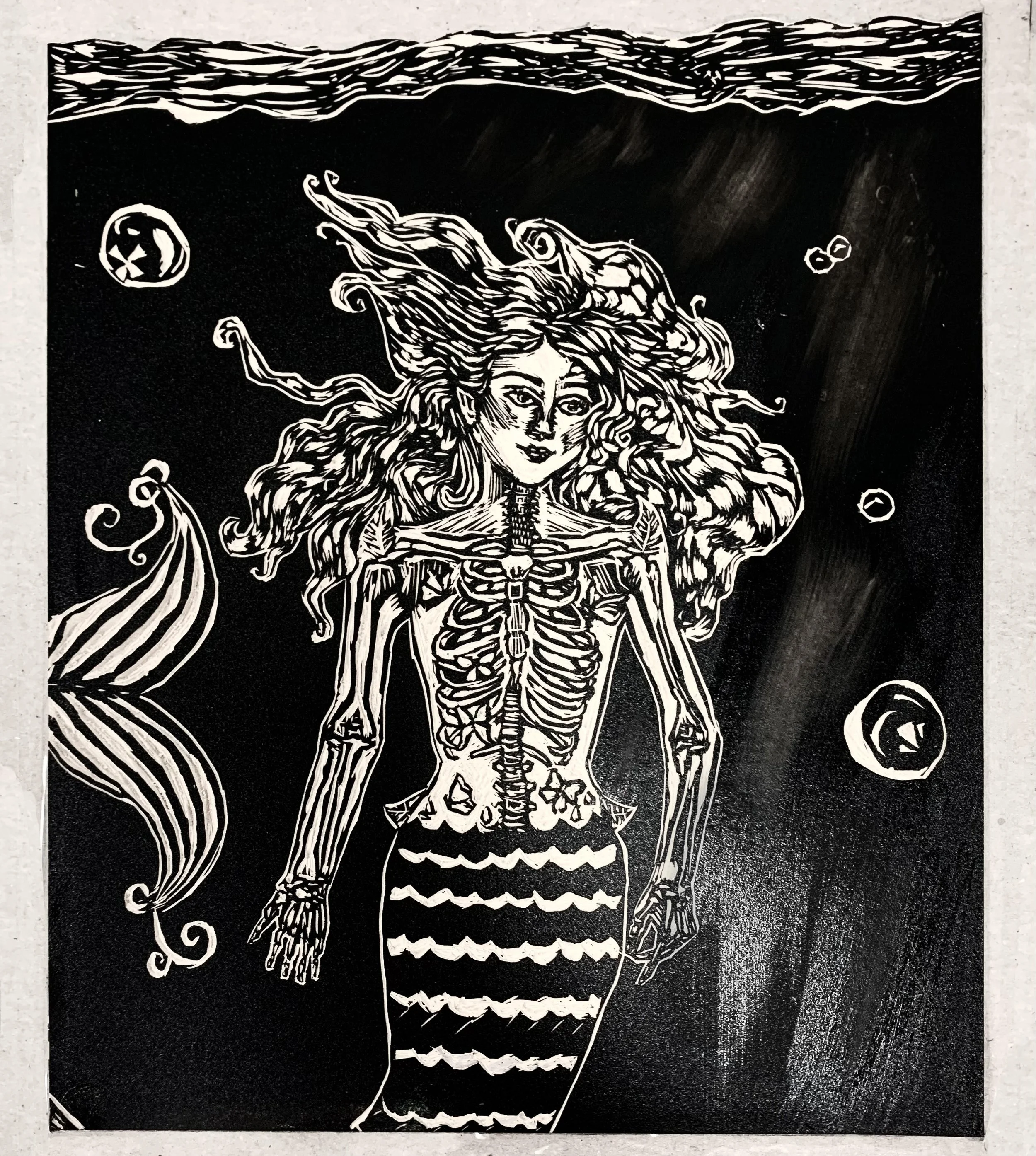 "Anatomy of an Anxious Mermaid" Linocut Print on paper 16x20" 2023